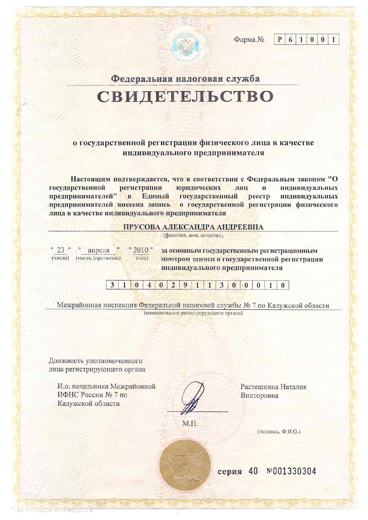 ОГРНИП: 310402911300010