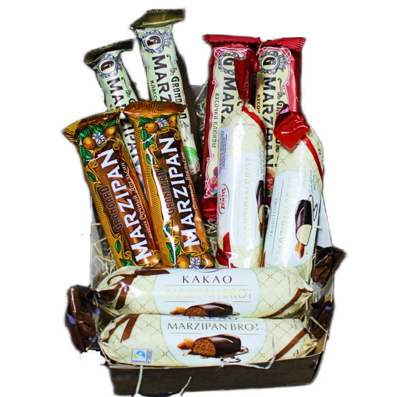 В составе целых 10 буханок марципана - целых 5 вкусов, среди которых 4 больших весом по 100 грамм и 6 штук весом по 50 грамм. Итого получается 700 грамм. В составе немецкие Marzipan Brot, Marzipan Brot какао, Grondard Marzipan классический, с клюквой и с апельсином.