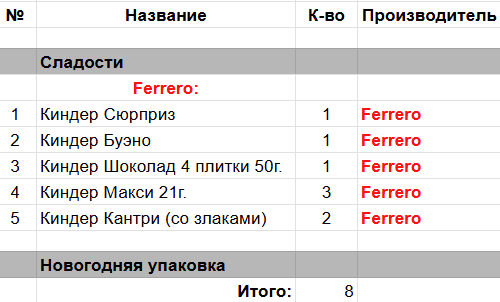 Составы детских подарков